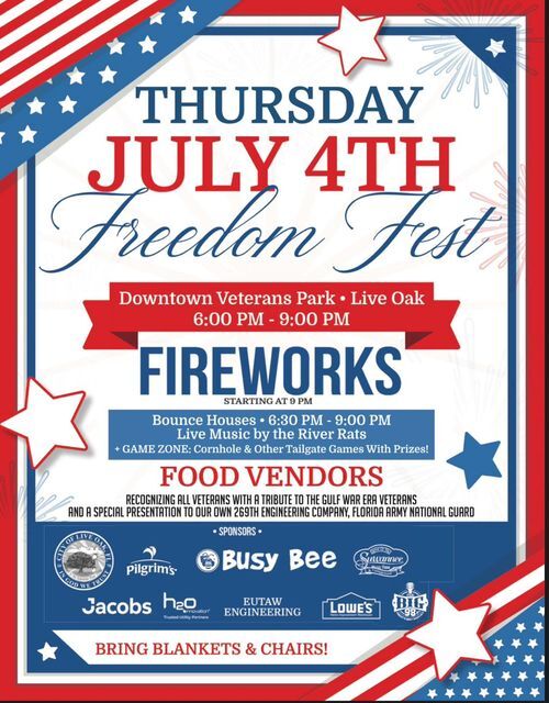 The City of Live Oak is hosting a Freedom Fest from 6 to 9 p.m. at the downtown Veterans park. Fireworks start at 9 p.m. Bring blankets and chairs.