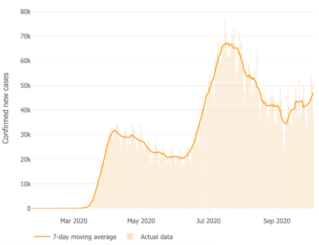 According to Johns Hopkins, transmission rates slowed throughout July and August as states like Texas and Arizona re-instituted more stringent lockdown procedures. By mid-September, case rates in the U.S. slowed to about 34,000 a day.