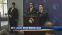 The scorecard shows results from over 43,000 votes on 59 legislative proposals, then grades them on key issues like welfare, wasteful spending, and tax hikes.