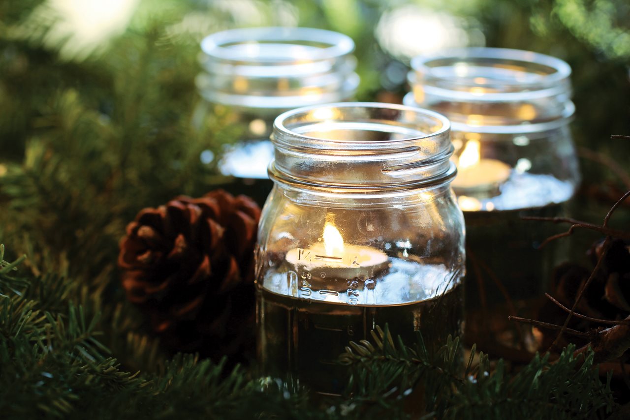 Choose three pretty ceramic or glass bowls for your centerpieces. Fill two with water and float several white tea candles in both (add whole fresh cranberries to float for a pop of color, if desired). Pick up some large pine cones (outside or at your local garden store or farmer's market), small evergreen branches and holly sprigs to arrange in the center bowl. If you’re working with mason jars, place greenery directly on the table to act as a runner. Light candles just before serving dinner.
