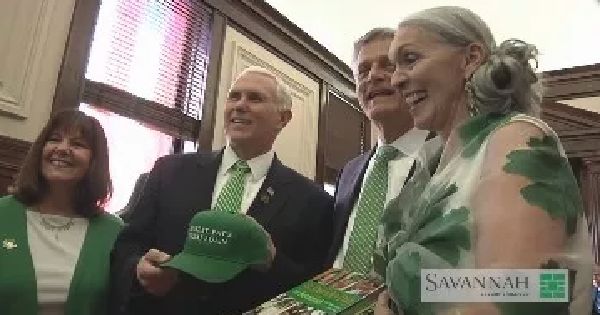 Mike Pence receives 'Make St. Patrick's Day Great Again' ball cap at Savannah City Hall
