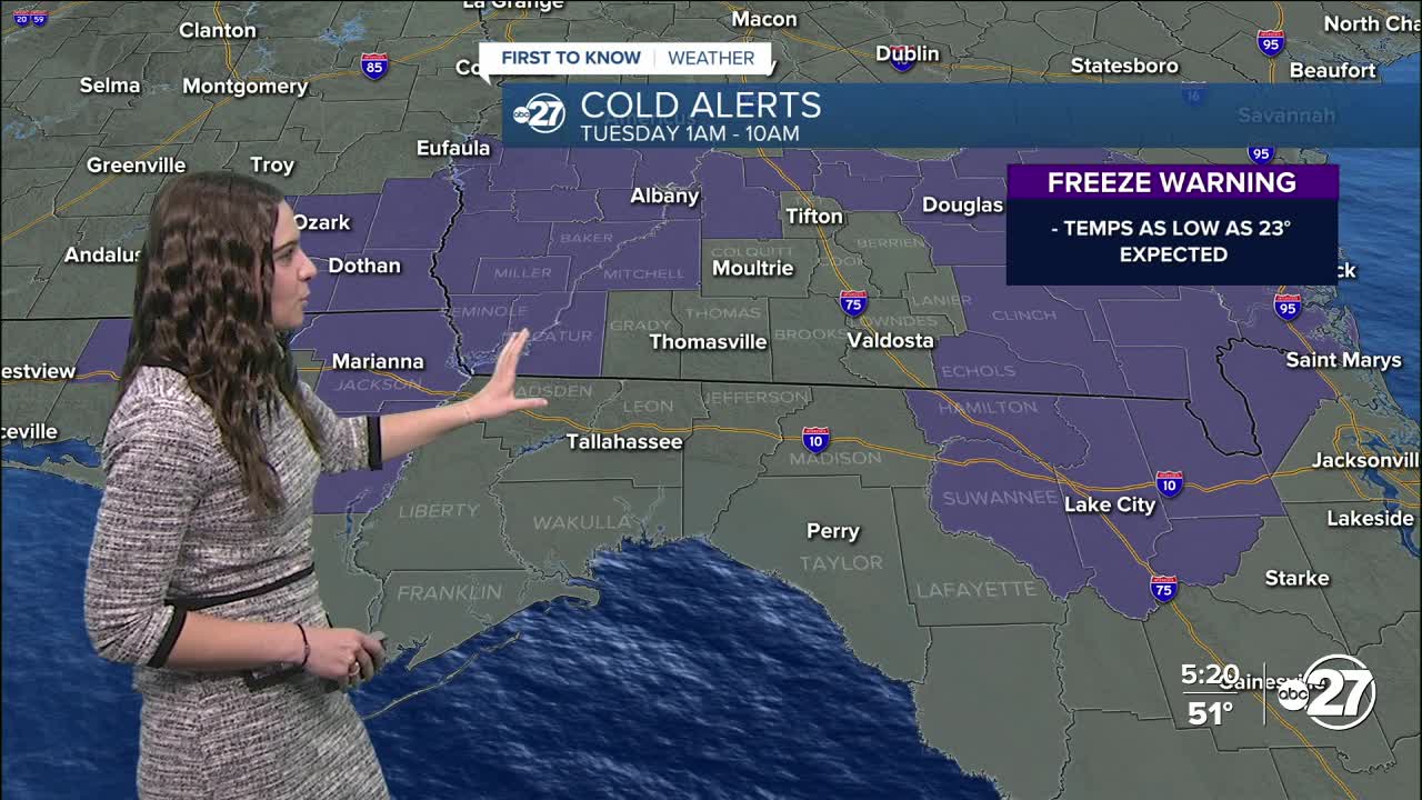 However, another Freeze Warning is in place for Jackson, Seminole, Decatur, Miller, Baker, Mitchell, Clinch, Echols, Hamilton, and Suwannee counties as temperatures are expected to get as low as 23°.
