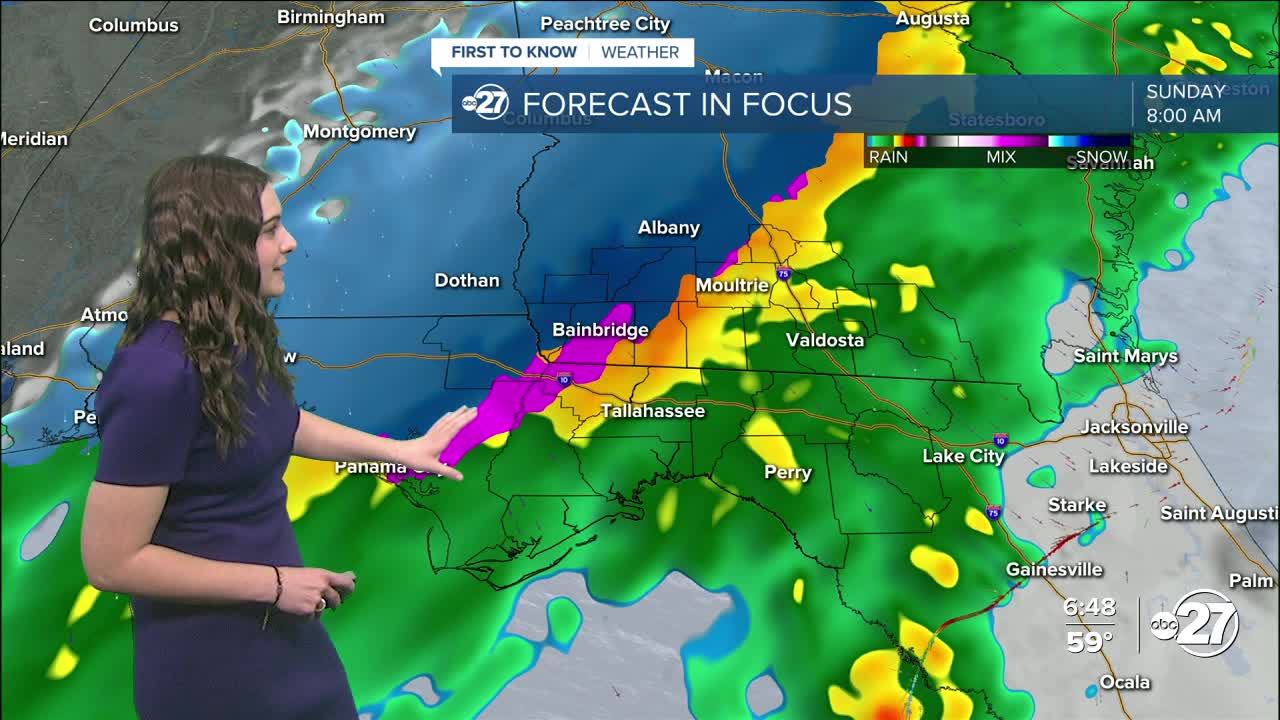 A Winter Weather Advisory is in place for Jackson, Seminole, Decatur, Miller, Baker, Mitchell, Colquitt, Tift, Cook, and Berrien counties from 4 a.m. to noon Sunday as these counties have the highest chance of seeing any winter weather.