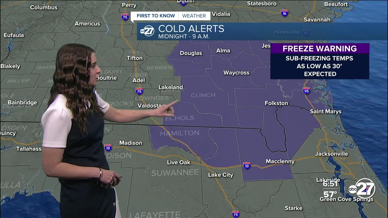 A Cold Weather Advisory is in effect for all counties from 5 a.m. to 9 a.m. Monday morning as wind chills are expected to drop as low as 17°. Additionally, a Freeze Warning is in effect for Clinch, Echols, and Hamilton county from midnight tonight to 9 a.m. Monday morning as temperatures as low as 30° are expected.