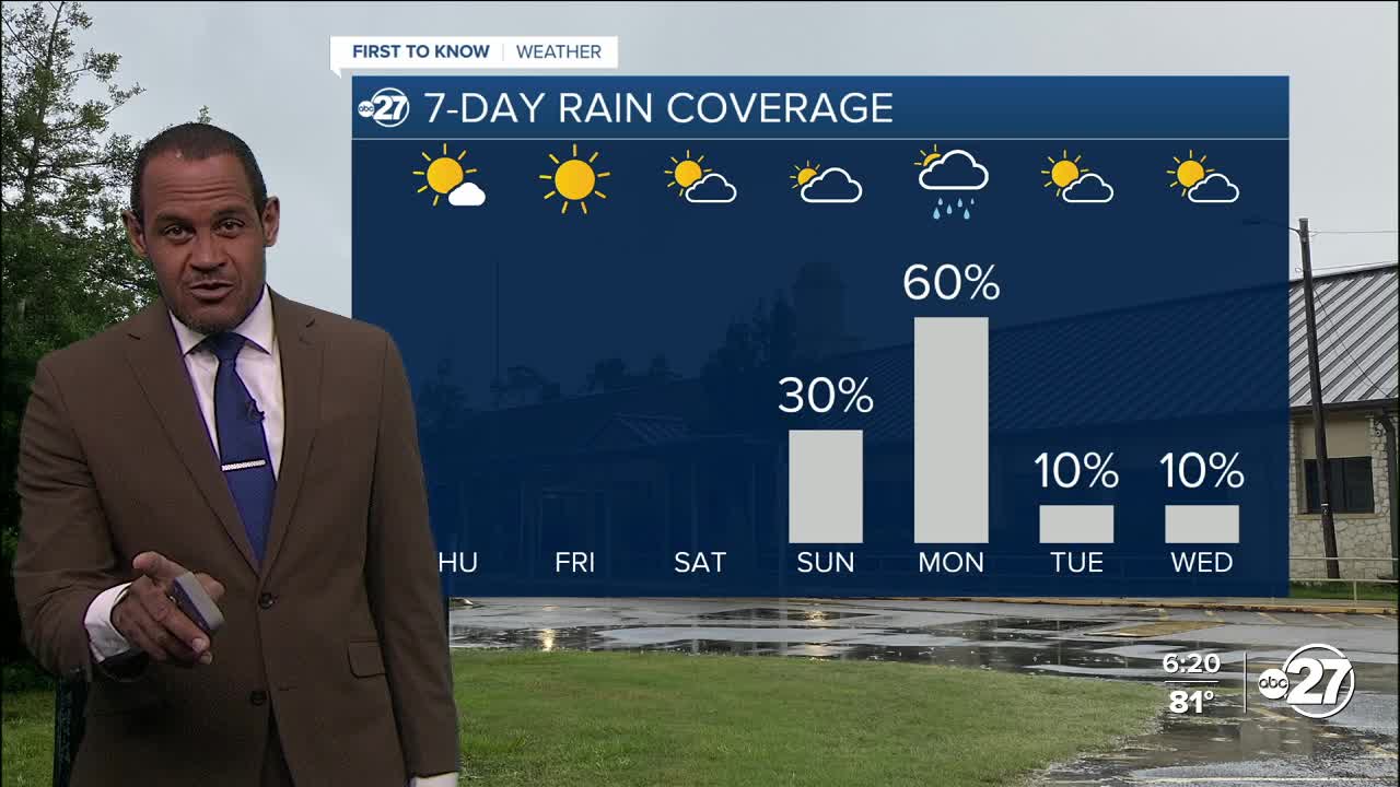 The next best rain chance comes late Sunday and Monday, with isolated thunderstorms in the mix.