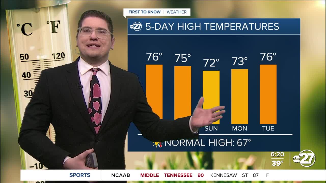 Valentine's day, looks relatively the same as today, except with more clouds. The drier air is keeping us cooler in the morning, but the sun is allowing us to cook up into the mid 70s by around 4pm. This will be perfect for both indoor and outdoor plans all day Saturday!