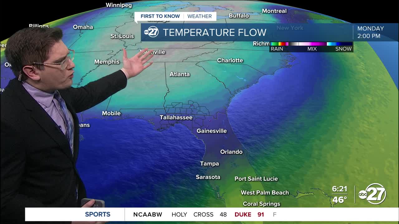 The bigger story is the freeze expected overnight tonight and into Wednesday morning. South Georgia will dip well into the 20s, with a few spots in northern Florida seeing similar temperatures. We will stay around freezing again tomorrow night before warming back up by Thursday as high pressure brings in more warmth from the tropics.