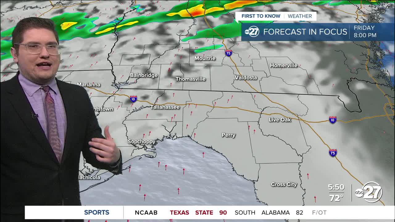 TALLAHASSEE, FL. — Today will be a day much like yesterday, but with more humidity. Walking outside this morning feels like walking into a blanket, temperatures are even in the low 70s to upper 60s. Clouds will once again dominate the skies, but like yesterday there will be some sun. Showers are possible in the afternoon, and thunder cannot be ruled out. Highs this afternoon could match, or break, the current record of 82° set in 1991.
