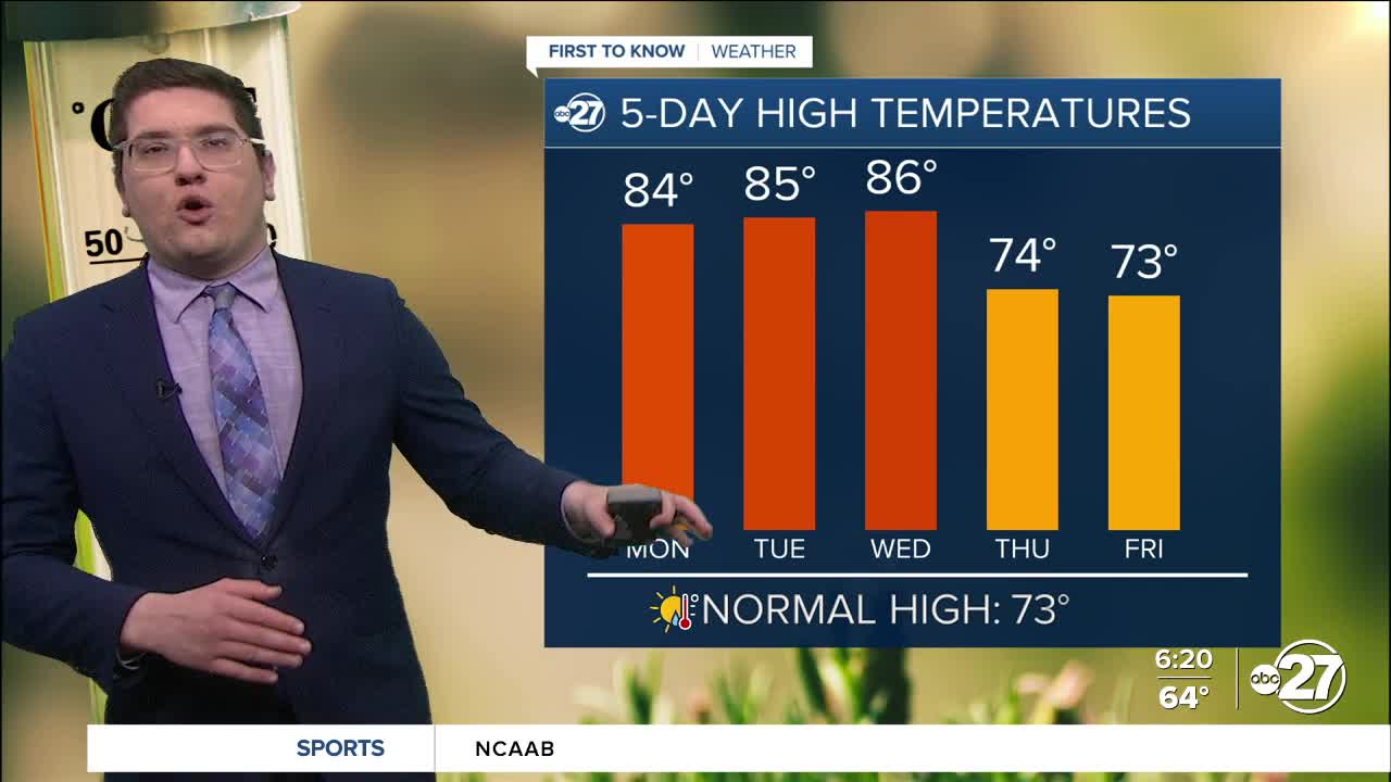 The afternoon will also keep the current pattern consistent. Highs will be in the mid 80s, much like the last few days. These temperatures will continue until Thursday when a cold front will drop the temperatures back closer to average.