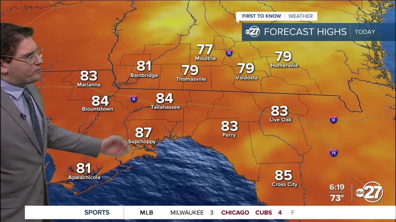 TALLAHASSEE, FL. — We are in store for a similar start to the day as the last few: partly to mostly cloudy, muggy, and warm. Morning temperatures will be in the upper 60s to low 70s, rising into the low to mid-80s by the afternoon. That is the first change from the upper 80s and low 90s we’ve been seeing. Bigger changes are on the way.