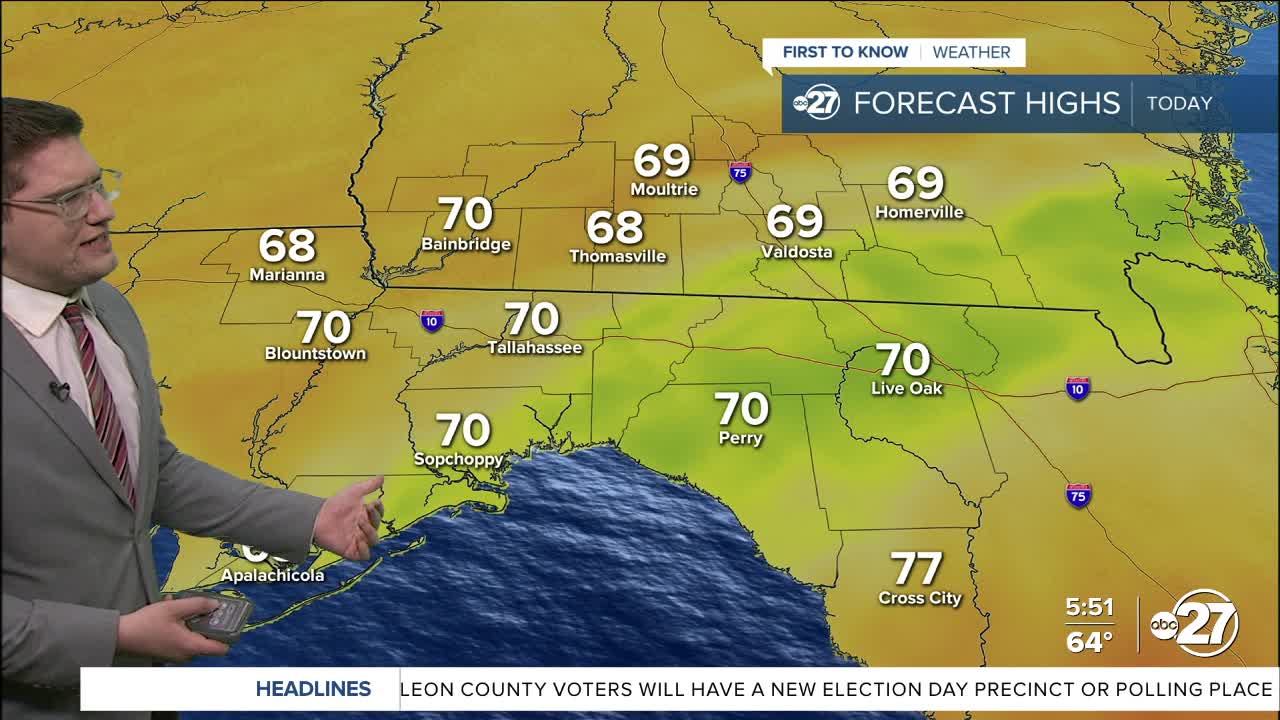 TALLAHASSEE, FL. — We are starting the day off in the 60s. Some 50s will dot the area as the cold front, and low pressure, moves through. Scattered showers will become more widespread rain as the sun rises, and could last until the sun sets.