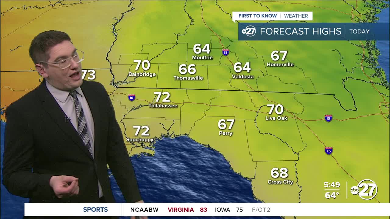 TALLAHASSEE, FL. — It is a warm start to the day today with temperatures in the low to mid 60s. While skies start off mostly clear clouds will build through the day as a cold front approaches.