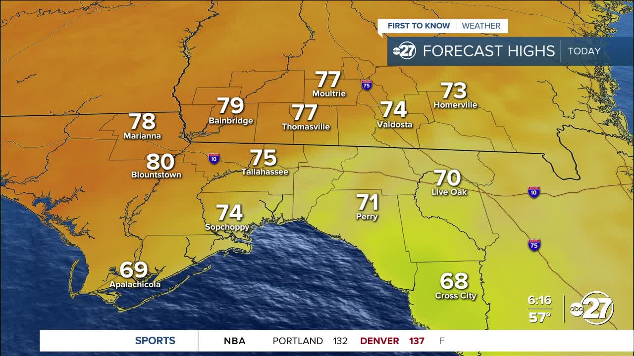 TALLAHASSEE, FL. — A few showers will linger before the sunrise with temperatures in the mid to upper 50s. Skies will clear through the morning, but only for a portion of the viewing area. These will focus around our southeastern counties.