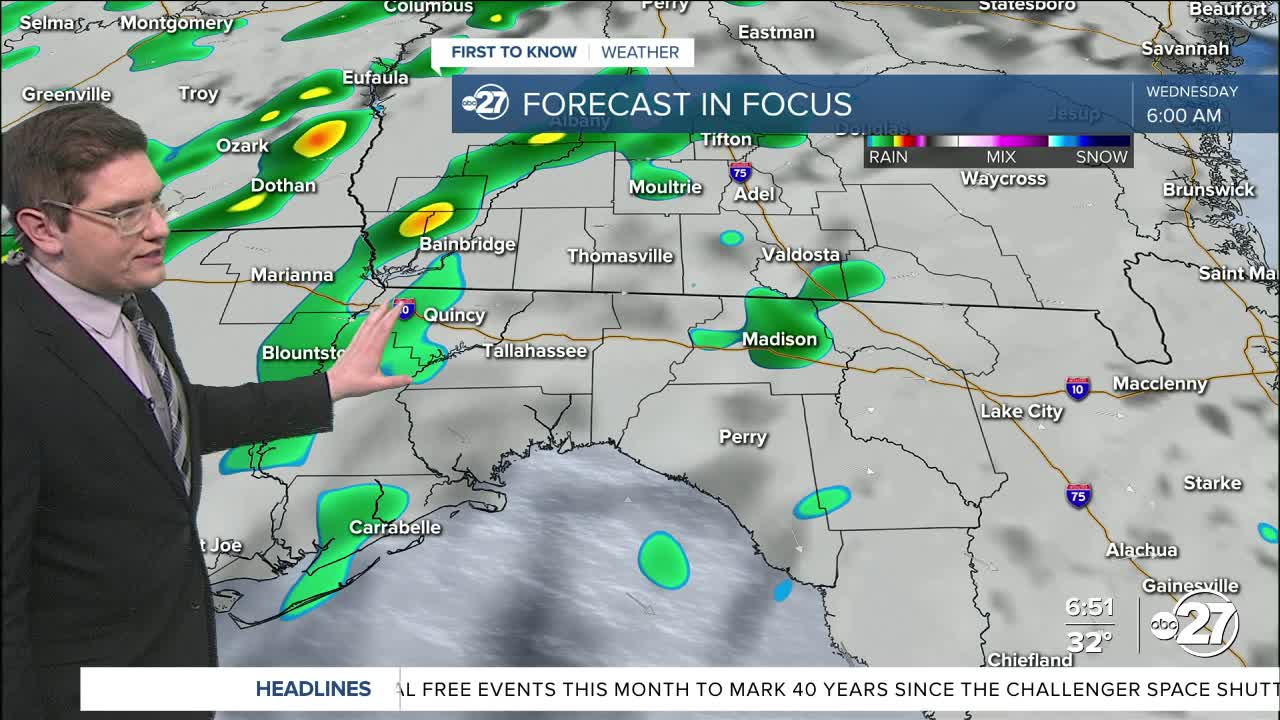 Temperatures could stay out of freezing tonight before a front sweeps through for tomorrow morning and afternoon. Scattered showers can start as early as 6 A.M. with more substantial rain around 9 A.M. While this first round will end around 2 P.M, another dose of showers can come through, around 11 P.M. Wednesday night into Thursday, ending before sunrise. Rainfall totals will be light at around 0.10"-0.25" or less. While the temperatures should stay out of freezing, we cannot rule out the possibility of something frozen falling from the sky. This chance is for south Georgia, but still remains very unlikely. If we do get either patchy slush or ice, it will not stick to the ground.