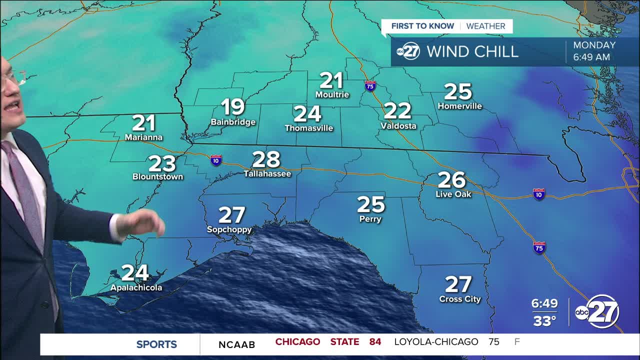 A freeze warning is in effect for our Georgia counties until 9 a.m., and a cold weather advisory is in effect for our Florida counties until 10 a.m. While many of us will be freezing this morning, the real impact will be the wind chills. We could reach the teens in some areas by the time the sun rises. Luckily, dew points are low, so frost is not likely on our cars this morning.