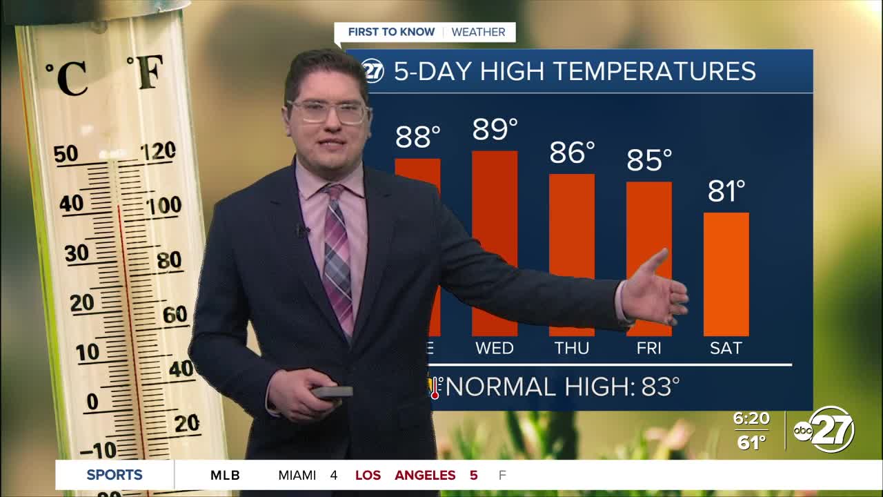 We are cooking up by midday, temperatures will be in the low 80s. We will be peaking in the upper 80s and possibly even pushing a 90 in spots. The humidity is sticking around, so it will feel a tad uncomfortable out there this afternoon, and that trend will continue until this weekend.
