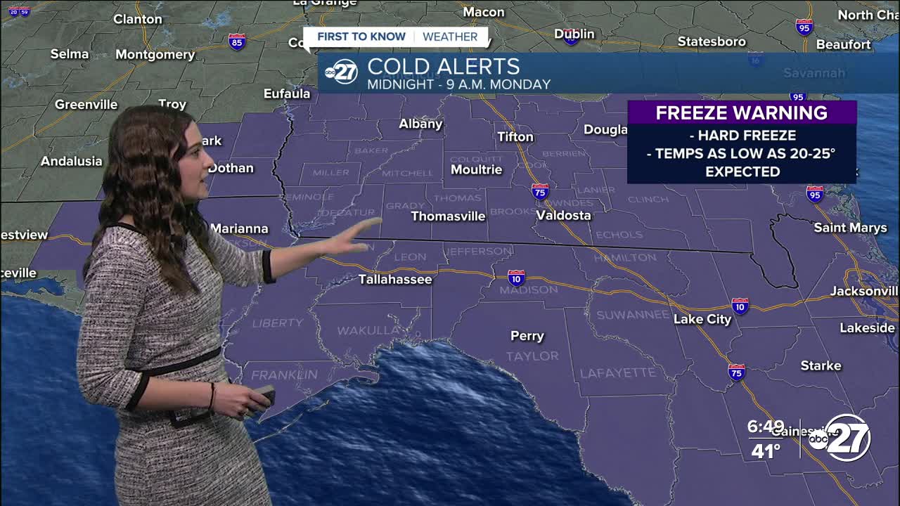 This has prompted both a Freeze Warning and Cold Weather Advisory. The Freeze Warning is in effect from midnight Sunday night to 9 a.m. Monday morning for a hard freeze as temperatures as low as 20-25° are expected. The Cold Weather Advisory starts 8 p.m. Sunday and runs until 10 a.m. Monday for all counties, excluding Colquitt, due to wind chills as low as 16° expected.
