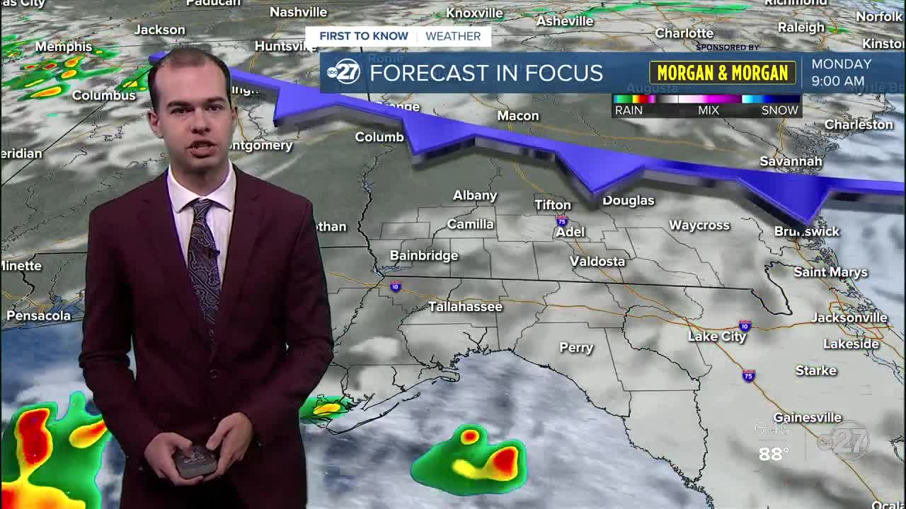 Tomorrow will begin as a sunny day across the region, with minimal cloud cover to start the day. This will help warm things up early, with temperatures soaring into the 90s by noon. An Excessive Heat Warning is in effect for most of our Big Bend counties, with the potential to see feel-like temperatures up to 115 degrees between 11am and 7pm tomorrow. This extreme heat will be dangerous to those outside for long periods of time, so make sure to drink plenty of water, wear light colored and light weight clothing, and limit your outdoor exposure, especially in the afternoon hours. Scattered storms will once again work their way into the forecast tomorrow afternoon, moving from a north to south direction yet again. Storms will start to pop around 2pm, with the chance for storms continuing after sunset until around midnight as a cold front approaches the region.