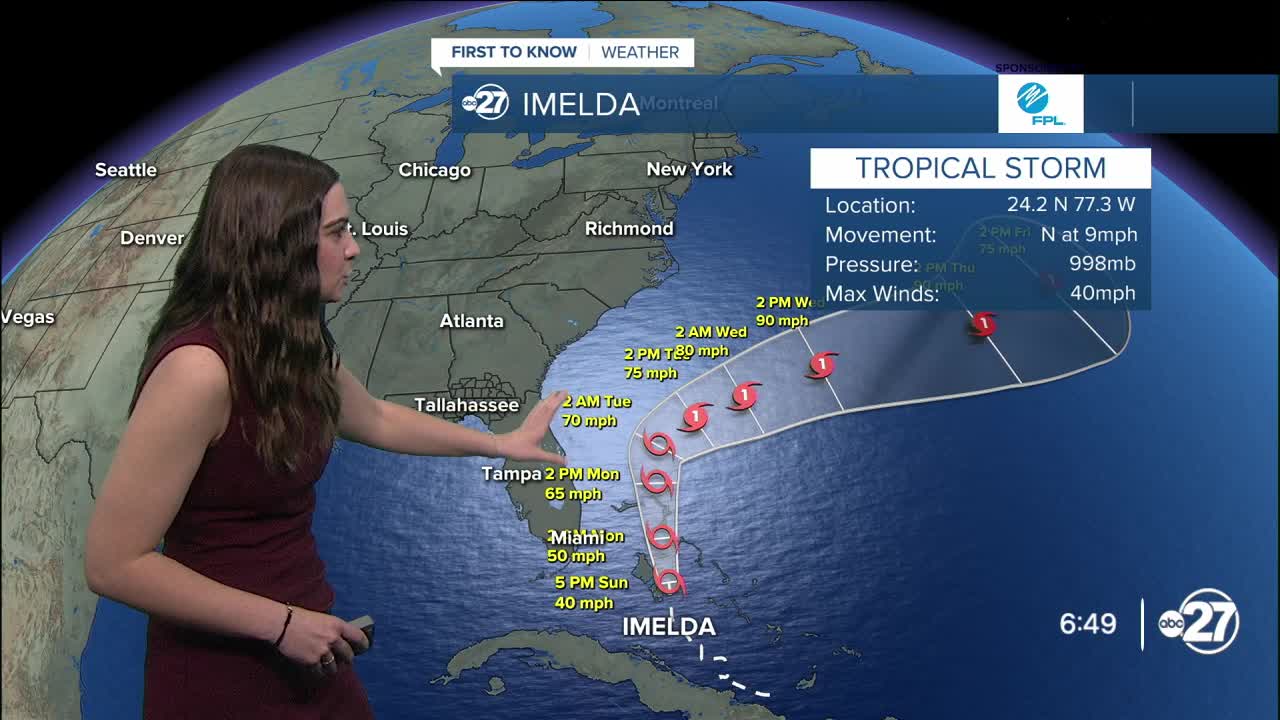 Once Potential Tropical cyclone Nine and Tropical Depression Nine is now Tropical Storm Imelda. The system is located over the Bahamas with maximum sustained winds of 45 mph and is moving north at 9 mph.